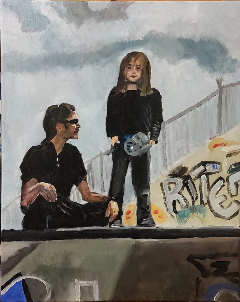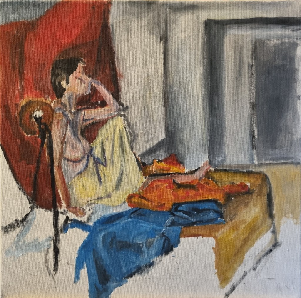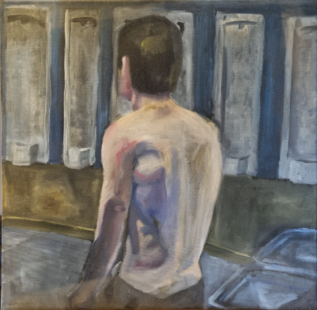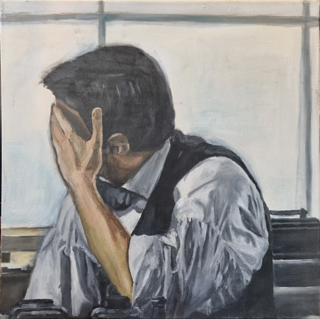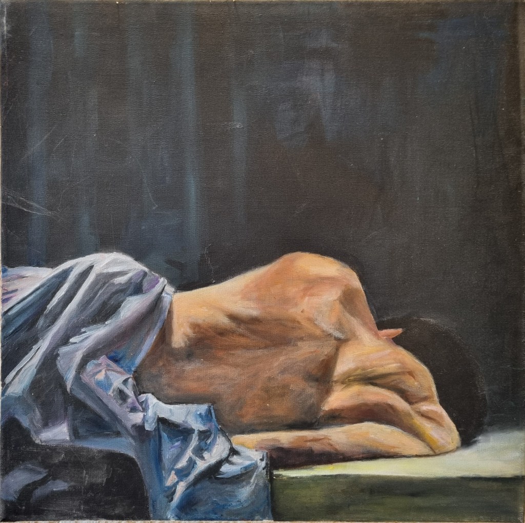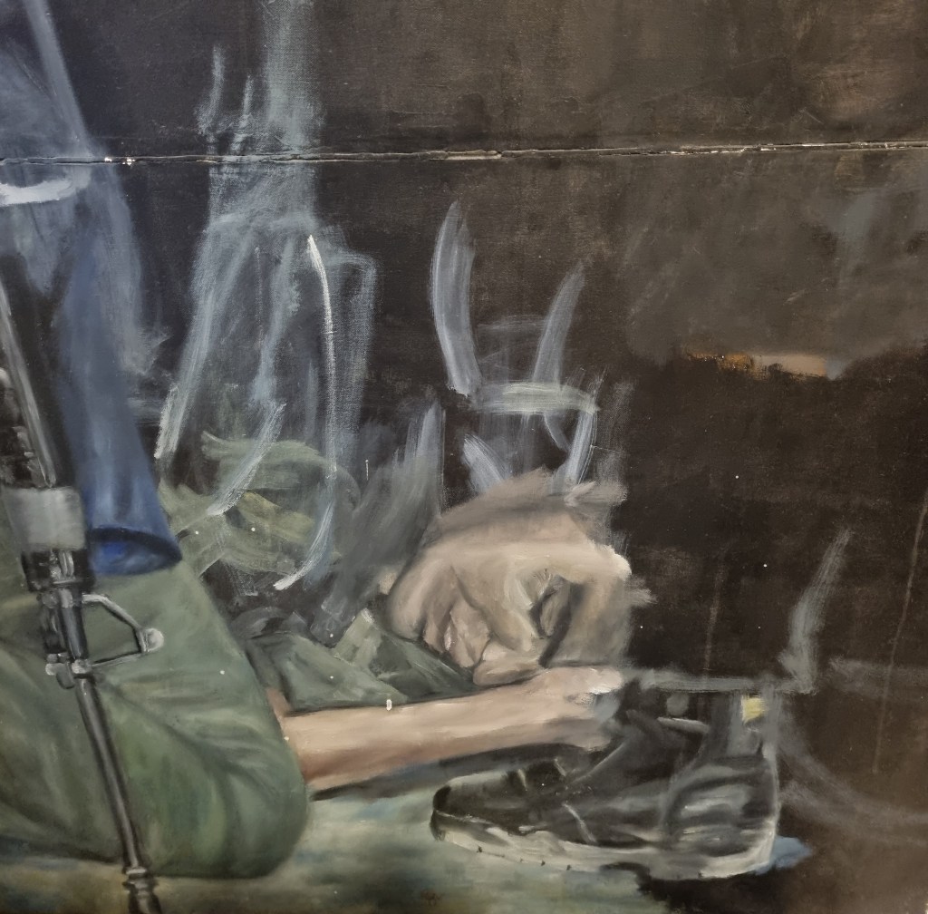 This is not a political painting. I found a press image, and the contrast between the military objects, the weapon, the shoe, vs. the pain in the wounded soldier’s face, was really striking to me.